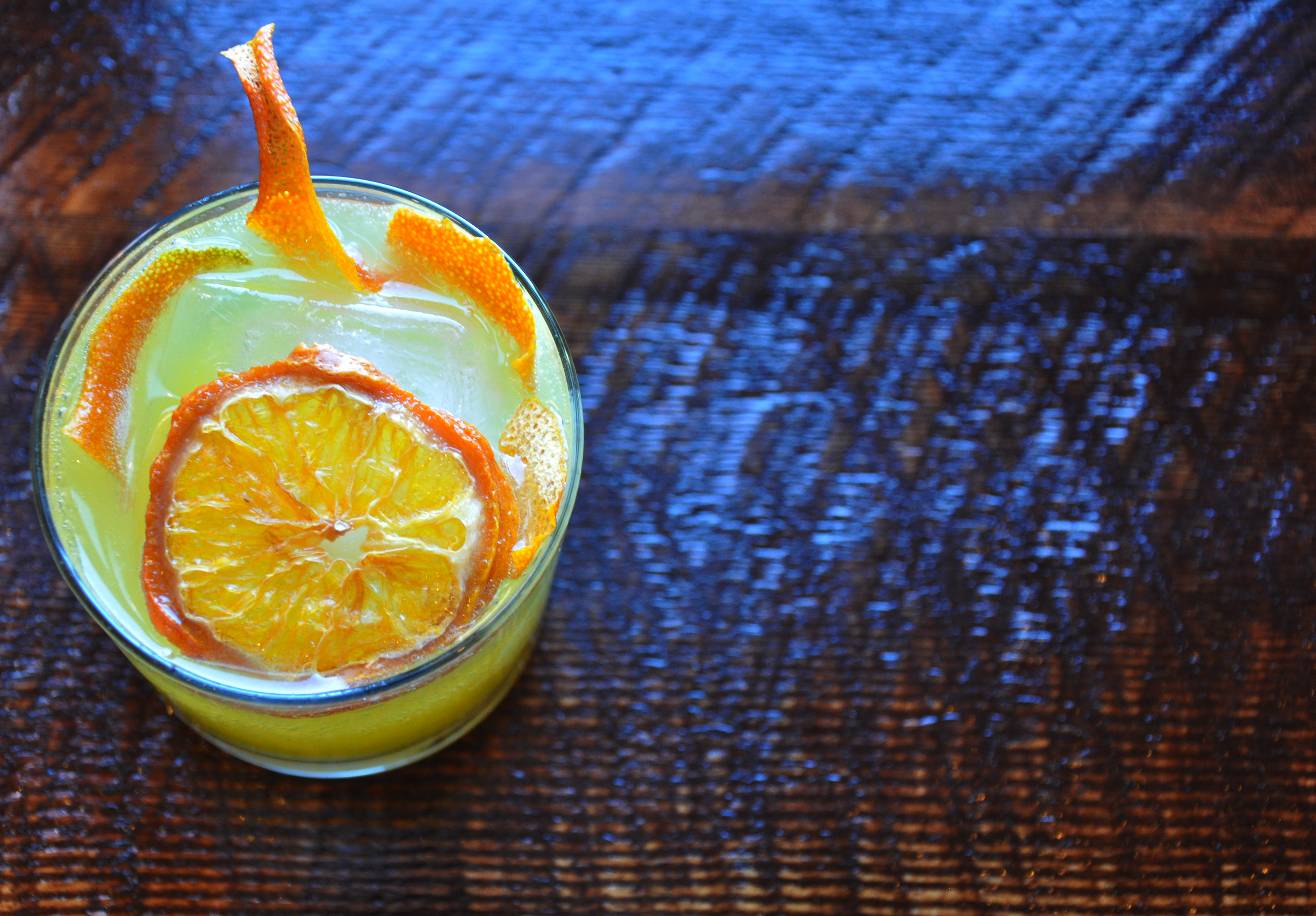 Combine all ingredients except tonic into a glass with a large ice cube, stir to combine. Top with tonic water, garnish with dried Orange peels or wheels.